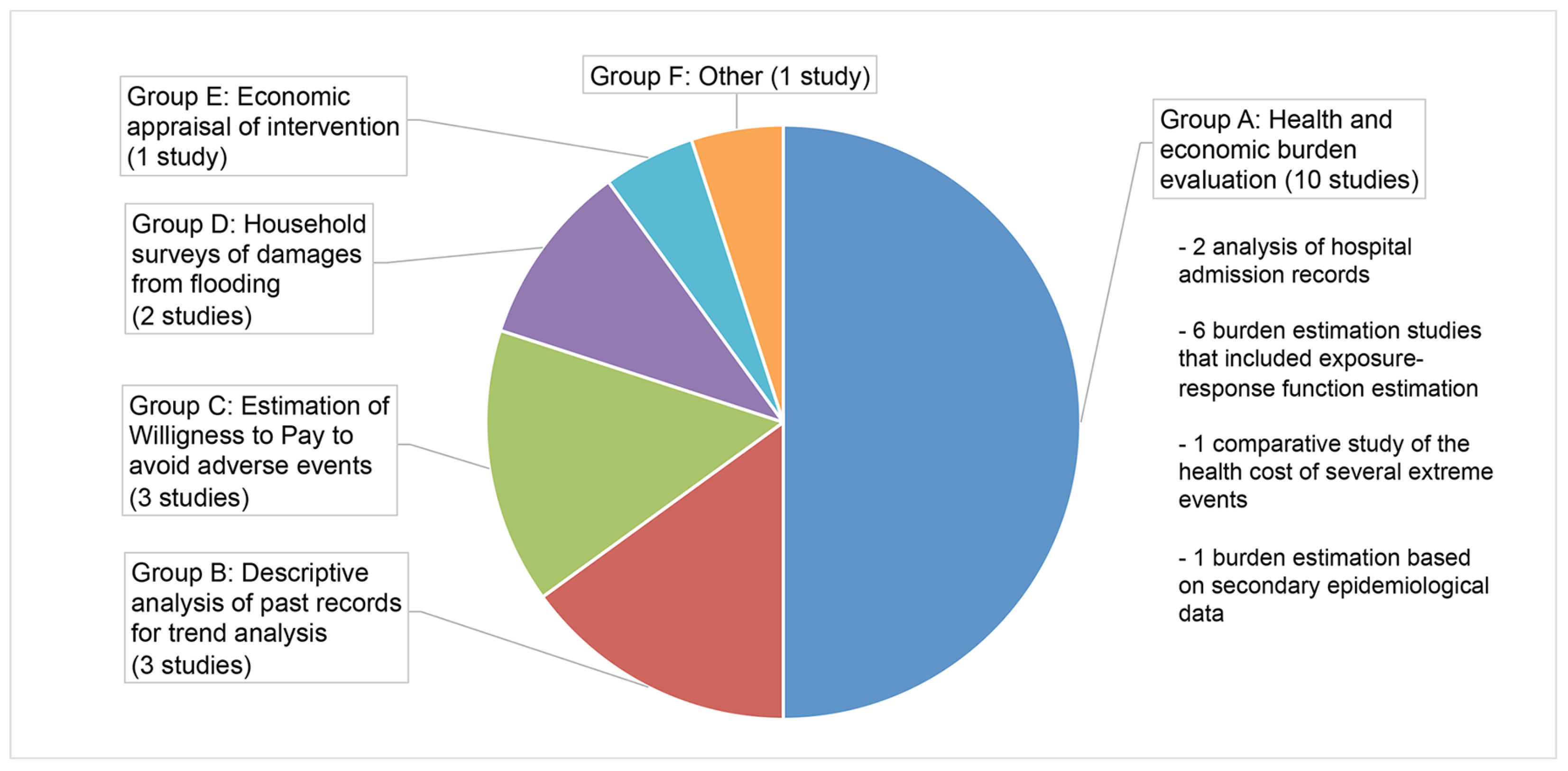 Half of the studies (n = 10) were classified as burden evaluation studies (Group A). They exhibited great variation in methods and could be further subdivided into four sub-groups (see Figure 3). Two studies [20,22] analysed hospital admission records for extreme temperature exposure, in order to provide an estimate of the healthcare cost burden associated with extreme heat and extreme cold. They also aimed to identify disparities in vulnerability to excessive temperature exposure between population subgroups stratified by age, gender and socio-economic status. Six studies performed an empirical estimation of the functional relationship between health effects and extreme event exposure using time-series data specific to their case studies, with a view toward estimating the associated health and economic burden. Three of these six studies focused on extreme heat [23,24,25], two on hurricanes [26,27] and one on smoke haze [29]. Among the three burden studies that focused on extreme heat as a health risk, two included projections of health and economic burden under IPCC climate scenarios [23,24]. The remaining two studies of Group A provided respectively: (i) a comparison of the burden associated with six types of climate-change related events (three of which were weather-related extreme events) that occurred in the U.S. over the period 2000–2009 [28]; and (ii) an estimation of the health and economic burden associated with the severe haze event of January 2013 in Beijing using secondary epidemiological data [30].