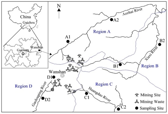 Wanshan features a hilly, karstic terrain covering an area of approximately 338 km2 and with an elevation varying from 270 to 1149 m above sea level. Karstic terrain is a landscape formed from the dissolution of soluble rocks such as limestone, dolomite, and gypsum. It has a subtropical, humid climate characterized by abundant precipitation and mild temperatures. Accordingly, the area is divided into four regions associated with its corresponding watershed: Xiaxi, Aozhai, Huangdao and Gaolouping (regions A, B, C and D, respectively). Most of the Hg mines and mine wastes are scattered in the valleys of the mid-western region, situated upstream of the rivers (Figure 1). Surface waters around the Wanshan Hg mines and retorts were significantly Hg-contaminated by the mine waste, but the impacted areas are limited to 6–8 km downstream from Hg mine wastes [34].