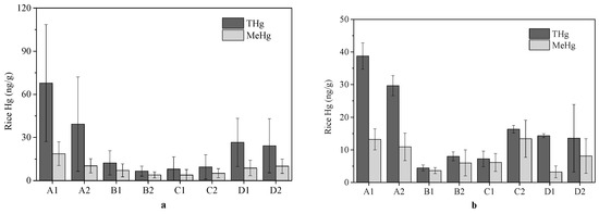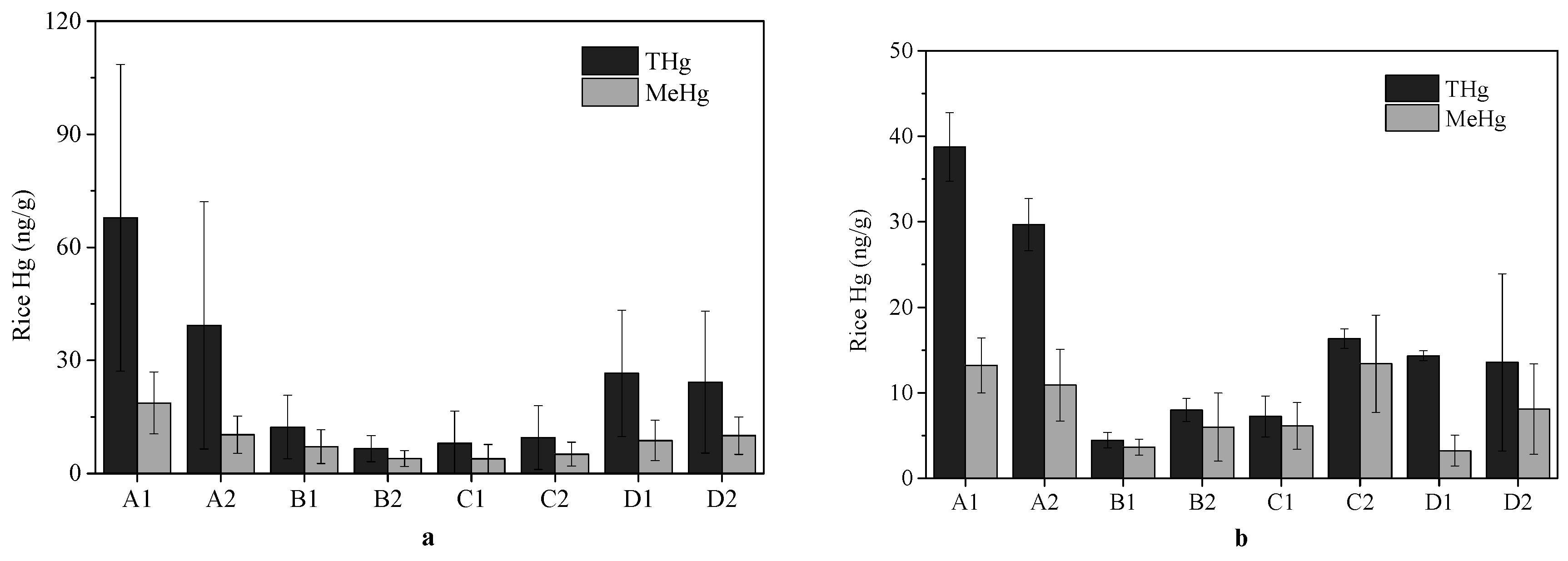 THg and MeHg concentrations are shown in Figure 2. THg concentrations in rice from the children’s homes ranged from 1.3 to 166 ng/g, with a mean of 14 ng/g, and, 37% exceeded the tolerance limit of Hg in human food (20 ng/g) as recommended by the Chinese National Standard Agency (CNSA) [40]. The averages of rice THg concentrations at each site ranged from 5.2 to 57 ng/g. MeHg concentrations in rice from the children’s homes ranged from 0.29 to 65 ng/g, with a mean of 6.1 ng/g. Among the eight sampling sites, average of rice MeHg concentrations ranged from 2.6 to 17 ng/g.
