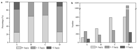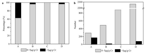 UHg is considered a good biomarker for human IHg exposure, and UNIDO set a limit of 5 μg/g Cr for the general population. The cumulative frequencies of UHg concentrations in this survey are shown in Figure 7a. After multiplying the total number of primary school children in each region by the frequency of each UHg concentration level, the total number of children for each concentration level in each region was obtained (Figure 7b). Approximately 9.7% (272) of UHg concentrations in the children exceeded 5 μg/g Cr. Most of these children lived in region A (172) and region D (80), which indicates a high level of IHg exposure close to the Hg mines of the Wanshan region.