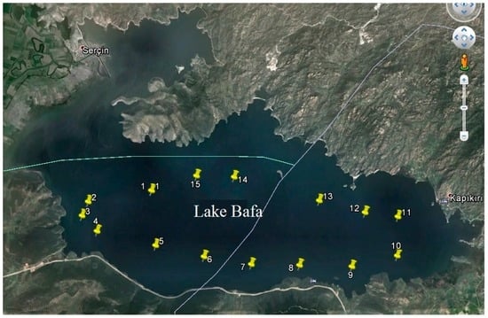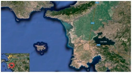 Lake Bafa is located in the southwestern part of Turkey, at the boundaries of Muğla and Aydın, at the coordinates 37°30′ N and 27°25′ E, as shown in Figure 1. The lake is mostly shallow, with a maximum depth of 21 m and a surface area of approximately 7500 ha. It is a delta lake formed by the Büyük Menderes River. The sediments of the river filled the marine, the Latimen Gulf, over the past six or so millennia; thus, it is separated from the sea [6]. Because of the ancient location area and the habitat of the lake, it has been legally protected as a natural park since 1994. In the villages around the lake, agriculture and fishing still occupy an important part of their economies.