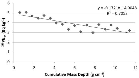 210Pbex activity concentrations on a logarithmic scale (ln) versus cumulative mass depth.