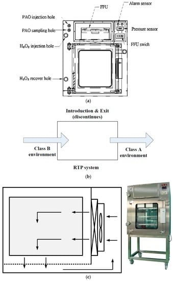 To make a good internal environment of the RTP chamber that is fully isolated from the exterior, variable frequency drive fans were utilized in the air-intake and the air-exhaust system, precisely controlling the filtered air flow and supplying an air-barrier protection. The aerodynamics allows for a one-way flow or airflow turbulence within the RTP chamber, under negative pressure compared to the surrounding environment. Supply and exhaust air can go through the high-efficiency particulate air (HEPA) filters (Efficiency 99.99% on 0.3 micron) to prevent the production of aerosols that could possibly escape into the ambient environment [16]. Following ISO 14644-1 [1], ISO 14644-7 [17], ISO 10648-2 [18], and ASTM (American Society for Testing and Materials) E2930-13 [19] standards, contamination control in the RTP chamber was evaluated. Experiments were carried out using airflow velocity meter (TSI Inc., 9535-L, Cole-Parmer, Taichung, Taiwan), an optical particle counter (Pacific Scientific Model Met One 2100.10, Ashtead Technology, Westhill, UK), a pressure meter (testo480-manual-0563_4800, TESTO, New Taipei, Taiwan) and a vaporized hydrogen peroxide generation detector (self-fabricated) to perform four validation tests (including airflow velocity, particle quantities, pressure decay and vaporized hydrogen peroxide amount) in the RTP chamber (Size: 960 mm (Length) × 600 mm (width) × 1120 mm (height), Air System Enterprise Co., Ltd., Taoyuan, Taiwan) as shown in Figure 1. The RTP chamber assisted the low-contamination inward and outward transfer of the product chambers or system parts into and out of the containment systems. The double door cannot be opened until the chamber is tied and closed in position.
