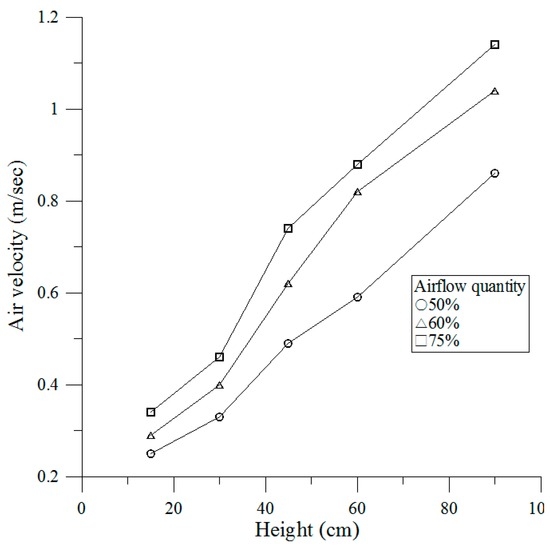 The vertical distribution of airflow velocities was determined by measuring 50%, 60% and 75% airflow quantity at varying heights (h = 15, 30, 45, 60 and 95 cm). The data shows that the airflow quantity produces a more important character in the airflow velocities. The measuring indicated that the airflow velocities are by the height from the platform substantially depends on 50%, 60% and 75% airflow quantity. The airflow velocities at four tested heights (15, 30, 45, 60 and 95 cm) were linearly related to the tested heights, giving a polynomial relation at the tested heights (15, 30, 45, 60 and 95 cm). Increasing airflow quantity more quickly promotes larger airflow velocities. When relating the effects of airflow velocities to the height using a multiple linear regression technique, we obtained the relationships between the airflow velocity and the height shown as Figure 5. Underneath HEPA filter (95 cm height), average airflow velocity is within ±0.00002 m/s, which are smaller and continued compliance with acceptance testing procedure of ISO 14644-3 C.4 [25].
