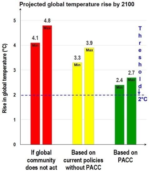 The predicted data suggest that global average temperature could increase by 4.8 °C by the end of 2100, and current policies (without PACC) were not good enough to deal with this global environmental issue []. Based on the facts, global leaders and stakeholders of global sustainability strongly believe that the PACC will help to reduce global greenhouse gas emissions and its adverse global impact. The threshold level is 2 °C (Figure 1); however, policy makers want to ensure that the global average temperature rise by 2100 will not exceed 1.5 °C by intensifying global efforts.