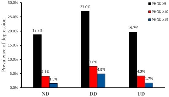 Prevalence of depression in different groups (p < 0.001). Abbreviations: ND: No diabetes; DD: Diagnosed diabetes; UD: Undiagnosed diabetes; PHQK: Patient health questionnaire score.