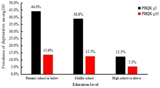 Among the ND group, the prevalence of mild, moderate, and severe depression was 18.7%, 4.1%, and 1.5%, respectively. The prevalence among the DD group for mild, moderate and severe depression was 27.0%, 7.6%, and 4.9%, respectively. For the UD group, the prevalence of mild, moderate, and severe depression was 19.7%, 4.2%, and 1.7%, respectively. The prevalence of depression was higher in the DD group than in the other two groups (Figure 1). Subgroup analysis shows that, among the DD population, the prevalence of depression was significantly different in terms of education level (p = 0.002). Participants who had not completed or gone any further than primary school had a higher prevalence of depression as compared with those in the two higher educational levels (Figure 2).