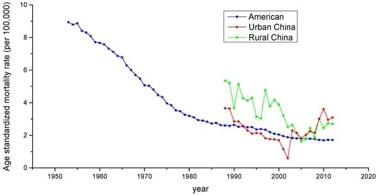 Cervical cancer mortality data were obtained from the WHO Mortality Database and the China Health Statistical Yearbook database for two countries: China and the United States. In our study, data for China were only available in the WHO Mortality Database from 1988 to 2000; therefore, data for the period 2002β2012 were collected from the China Health Statistical Yearbook database. Because mortality data for 2001 were not available, we calculated the average of the surrounding four calendar years instead of the average value for 1998β2002 []. In this study, data for China were obtained from urban and rural regions of mainland, the data of urban China include municipalities and prefecture-level cities, and the data of rural China include counties and county-level cities. The data of China in our study covered 31 provinces, cities and municipalities, accounting 1/100 of the total population. With reference to China, the data were collected from Vital Registration, the Ministry of Health, China Vital Statistics-Deaths, and the mortality data for China comes from 161 Death Cause Surveillance Points nationwide, which used multi-stage stratified randomized sampling. Therefore, the data are basically reliable. To better understand the temporal trends and accurately analyze the secular trends in urban and rural regions in mainland China, we collected data for urban and rural regions in China from 1988 to 2012. For comparison, we also collected cervical cancer mortality data for the United States during the period from 1953 to 2012 [].