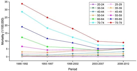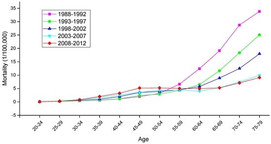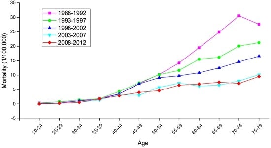 In the United States, the mortality rates observed in different age groups generally exhibited a steady declining trend with time, except for the age groups containing women aged 30β34, 35β39 and 40β44 years, which demonstrated higher mortality rates during the period 1988β1992 than the period 1983β1987. Similar in trends to China, mortality in the U.S. increased with age during the entire observation period, and the mortality observed in the groups of women aged 60β79 years experienced a steeper decline with time period than did those of the other age groups.