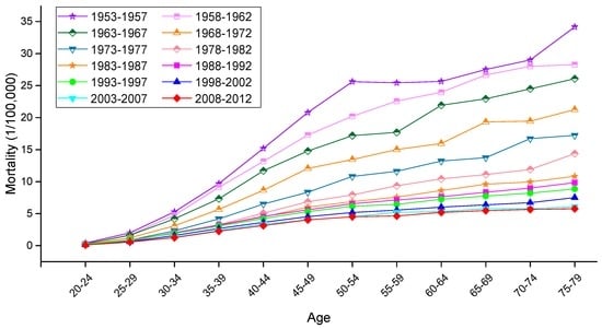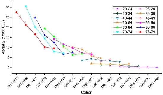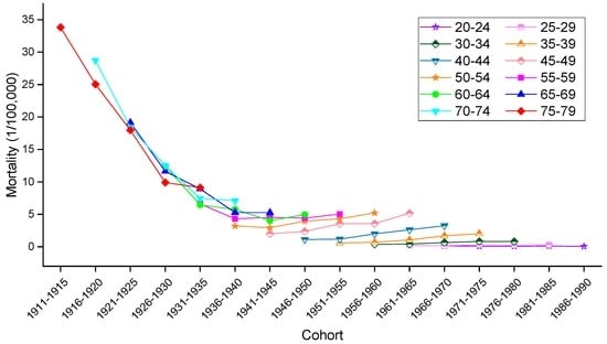 As one of the most common gynecological cancers, cervical cancer ranks as the second most prevalent malignancy after breast cancer and the third leading cause of cancer-related mortality (after lung and breast cancer) among women worldwide [,,]. Although a decreasing trend in cervical cancer mortality associated with the implementation of various preventive measures and clinical methods has been observed in a number of developed countries over the last several decades, it remains an important cause of morbidity and mortality that threatens the health and lives of women worldwide [,]. Therefore, to better understand factors associated with different cervical cancer mortality trends and assess the effects of public health control policies in different areas, analyzing the secular cervical cancer mortality trends in association with the independent effects of age, period and birth cohort seemed particularly important [].