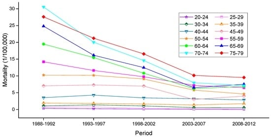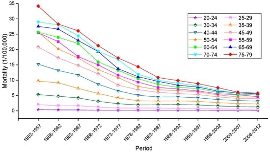Taken together, the mortality rates during the period 1988β1992 were higher than those observed during the other four periods, which was largely driven by the rate observed in the group aged 50β54 years; conversely, the cervical cancer mortality rates for all age groups during the periods 2003β2007 and 2008β2012 were relatively lower than those observed during the other three periods and showed the lowest rate of increase. In the United States, the mortality rates observed during different periods all presented an increasing trend with age, and the rates during the periods 1953β1957 and 2008β2012 demonstrated the highest and lowest levels in all age groups, respectively. The variation trends of the cervical cancer mortality rates in different age groups among Chinese and U.S. females are shown in Figure 5, Figure 6 and Figure 7. In urban China, the four groups including women aged 60β79 years clearly showed a sharp decreasing trend, while the age groups including women aged 30β49 years increased gradually, and the mortality rates observed in the remaining age groups fluctuated without a clear trend during the whole observation period. Overall, mortality increased over the entire observation period with older age group; this was particularly exhibited in the group of women aged 75β79 years, which declined at the fastest rate but maintained the highest level of mortality. Different from urban China, the trends in rural China indicated decreasing rates in all age groups during the whole period, except for the age group including women aged 45β49 years, which demonstrated an irregular fluctuating trend during 1988β2012. Additionally, mortality decreased more rapidly with increased age, while the mortality rates observed in older groups were higher than those in younger groups during the same period, indicating that the older groups were still at higher risk of death.