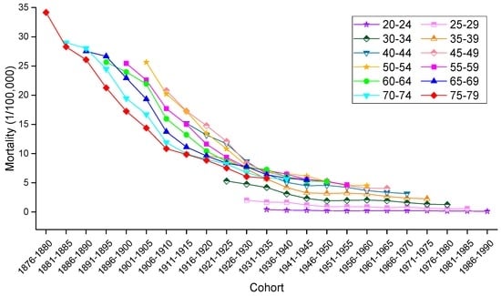 Consistent with the overall trends, mortality rates in the United States fluctuated more violently in the older age groups than in the younger groups, which fluctuated gently over the whole cohort period. In particular, in a phenomenon noticeably different from that observed in China, the variation trend of the mortality rates was unevenly associated with age within the same birth cohort; nevertheless, the mortality rates observed in the cohorts born before 1945 consistently decreased within the same age groups, and the rates observed in the age groups including women aged 45β79 years declined steadily with cohort years.
