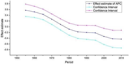 The age-period-cohort (APC) model has been widely used in the fields of sociology and epidemiology over the past 80 years [,,]. The APC model is based on the Poisson distribution and can reflect temporal trends in diseases by age, period and cohort and after adjustment for age, period and cohort. However, a non-identification problem may still exist as there is a linear relationship between the age, period and cohort, which makes it difficult to estimate the unique set for every age, period and cohort effect []. To solve this problem, the intrinsic estimator (IE) method, which is associated with the APC model and was proposed by Yang and Fu [], was used [,]. We used the Akaike information criterion (AIC) and the Bayesian information criterion (BIC) to evaluate the goodness-of-fit of the model. The STATA 12.0 software (StataCorp, College Station, TX, USA) and SAS 9.13 (SAS Institute, Cary, NC, USA) programs were chosen as the statistical analysis software for all statistical analyses.