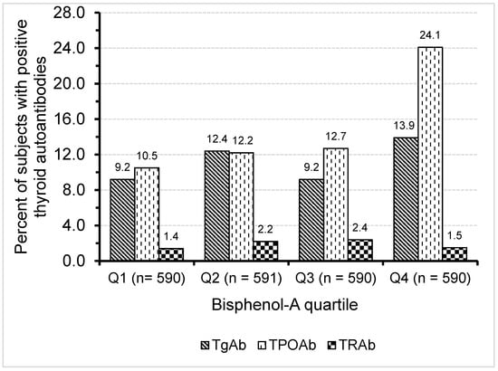 Percent positive rate of thyroid autoantibodies in relation to BPA quartiles.