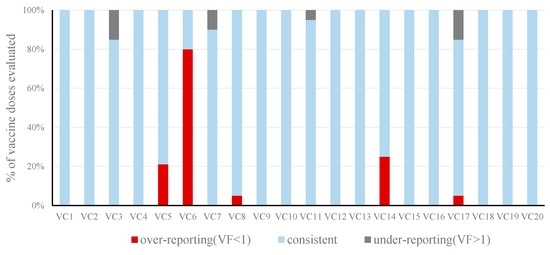 A VF of <1 indicates that lower numbers of vaccinations are recorded as administered at the vaccination clinic compared with those reflected in the file records sent to Shangyu District CDC (over-reporting). Conversely, VF of >1 indicates that higher numbers of doses are recorded as being administered at the vaccination clinic compared with those reflected in the file records sent to Shangyu District CDC (under-reporting). To characterize reporting consistency, the VF was classified into three categories in this study: (1) consistent if the VF was between 85% and 115%; (2) under-reporting if the VF was >115%; and (3) over-reporting if the VF was <85% [6]. The proportions of VF as consistent, under-reporting, and over-reporting were calculated, and the proportions of vaccination clinics with VF as consistent, under-reporting, and over-reporting were calculated for each vaccine dose.