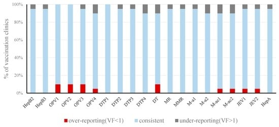 Among the 20 vaccine doses assessed, the VF ranged from 0.07 to 3.25 among 20 vaccination clinics. Only DTP1 had consistent data in all 20 vaccination clinics. Nine vaccine doses (four doses of OPV and DT, two doses of MPV-ac, and two doses of JEV) had under-reporting data, and 17 vaccine doses (HepB2, HepB3, OPV3, OPV4, DTP2, DTP3, DTP4, DT, MR, MMR, two doses of MPV-a, two doses of MPV-ac, two doses of JEV, and HepA) had over-reporting data (Figure 2).