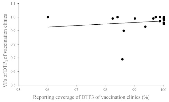 No significant correlation between the VF of DTP3 and the reporting coverage of DTP3 at the vaccination clinic level was observed, with a Spearman correlation coefficient of 0.399 (p = 0.082) (Figure 3).