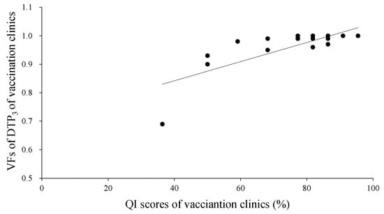 Figure 4 showed a strong correlation between the VF of DTP3 and the QI score at the vaccination clinic level, with Spearman correlation coefficients of 0.627 (p = 0.003).