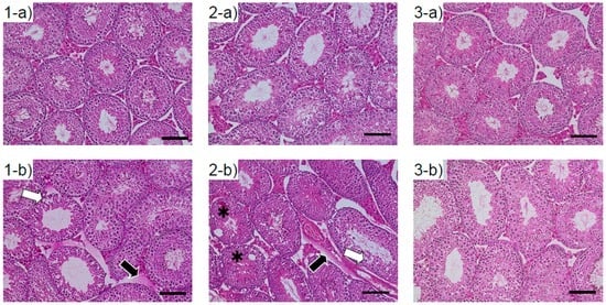 Testicular tissue of male offspring exposed to ASD as fetuses. 1: 5-week-old mouse; 2: 10-week-old mouse; 3: 15-week-old mouse. a: control; b: ASD group, ×200 magnification. H&E stain. At 5- and 10-weeks-old, mice in the ASD-exposed group showed seminiferous epithelial damage (white arrows). Interstitial edema was observed in the testes of fetal ASD-exposed mice at 5 and 10 weeks (black arrows). Vacuolation was seen with some seminiferous tubules *. These observations were found in other animals (N = 6, each group).