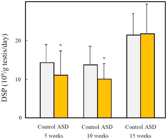 Effects of fetal ASD exposure on spermatogenesis. A right testis sample was weighed, and seminiferous tubules were released from the tunica albuginea into a saline solution in a homogenizer tube. The tissue was homogenized, diluted to the desired volume, and a sample of the diluted suspension was taken to count sperm heads or sperm cells in a haemocytometer chamber. DSP was calculated as described in Methods. N = 16, 16, 16, 12, 13, and 13 for 5, 10, and 15 weeks control, 5, 10, and 15 weeks ASD, respectively. * p < 0.05, vs. controls. DSP: daily sperm production.