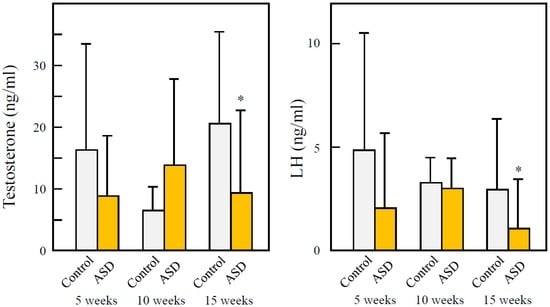 Effects of fetal ASD exposure on serum testosterone and serum luteinizing hormone (LH) concentration. Testosterone and LH levels in serum were determined by ELISA. Means ± SD. N = 16, 16, 16, 12, 13, and 13 for 5, 10, and 15 weeks control, 5, 10, and 15 weeks ASD, respectively. * p < 0.05, vs. controls.