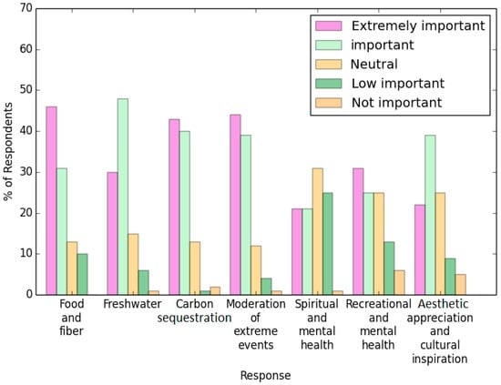This study assessed seven ecosystem service indicators. When assessing people’s understanding of the importance of these indicators, the following items received the four highest weighted scores: food and fiber, freshwater, carbon sequestration, and moderation of extreme events (Figure 5).