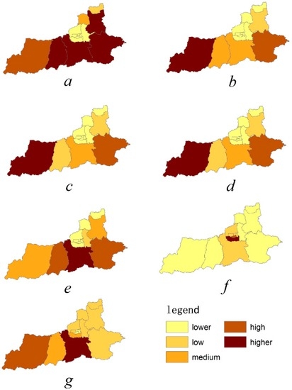 Based on each index’s calculation method, we established values for each ecosystem service indicator used across regions (Supplementary Materials Table S1). Figure 6 provides the quantitative values of the ecosystem service supply capacities for Xi’an counties. We took the highest and lowest value of each index, and divided into five approximately equal intervals based on averages. The five intervals were defined as lower, low, middle, high, and higher. The following figure displays the indicators’ spatial distribution. Examining the five levels for each indicator showed that indicators and supply capacities clearly varied across counties. Food and fiber were at a higher level in four regions; the other six indicators were at a higher level only in one region. Recreational and mental health was at a lower and low level in most regions. This indicated that the supply capacity of ecological system services on this aspect was poor overall. There were no areas where ecosystem services for all seven indicators were classified at a higher level. There were also no areas where services were all classified at a minimum level; levels varied from region to region. Thus, it is essential to calculate the ecosystem services of all seven indexes across areas.