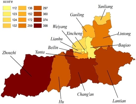 We calculated the scores of ecosystem services supply capacity across all the areas using the same method (Figure 7). The highest score was for Zhouzhi county, at 398. This was followed by Chang’an district and Lantian county, with scores of 374 and 360, respectively. Scores decreased in sequence for Yanta district, Gaoling district, Beilin district, Yanliang district, Lianhu area, Weiyang area, and Baqiao district. Xincheng district had the lowest score of 112.