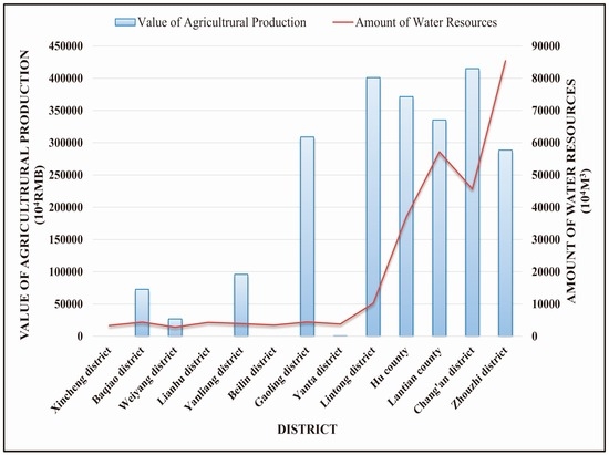 This study framework has a number of advantages. For example, it investigated stakeholder preferences, allowing for reductions in the contradictions that emerge in developing water resources management policy. For example, traditional water resources management considers the problem of needing sufficient water for agricultural irrigation, highlighting grain production as an important factor. This paper contrasted the value of agricultural production with peoples’ overall preferences (Figure 9). Based on this collaborative relationship, we found that ecosystem service values provide more extensive reference points for water resources management, and offer possible directions for reform. This study highlights that a single index offers only a partial view. For example, in a Xincheng district, the Beilin district, and the Lianhu district, there is no expressed value from agricultural production. However, these three locations cannot be ignored when formulating water resources management policies. These three places are located in Xi’an’s downtown area, where there is higher domestic water demand and a synergistic relationship with people’s overall preferences.