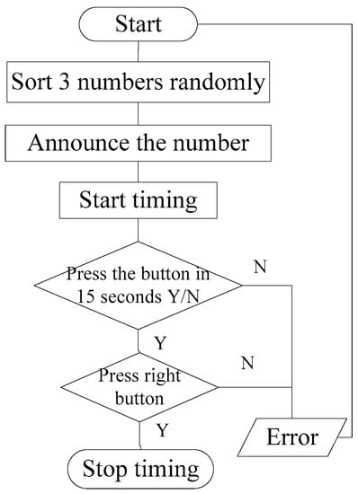 The length of time of a reaction determines whether or not the response is timely. Hence, the reaction time was chosen as the measurable characteristic that was used to reflect the reaction ability. The reaction time was measured using a small keyboard affixed to the right side of the steering wheel. It was important to design the reaction time test method independently, and ensure that it would have no effect on driving. Simple reaction time and choice reaction time are the two types of driver’s reaction times. The simple reaction time is the length of time that a driver spends making a single response to a single stimulus signal. However, there is a lot of information that a driver needs to consider to make decisions during actual driving, so their thinking process should also be taken into consideration. Hence, a choice reaction time is selected in this research. A range of different types of information are shown to a driver randomly, and the driver must respond differently to each different type of stimulus signal. The method for the driver’s reaction time test can be described as follows: The computer announces a number (1, 2 or 3) randomly, and the driver needs to press the right button as fast as possible. The period between announcing the number to pressing the button is defined as the driver’s reaction time. The flow chart of the reaction time test is shown in Figure 1.