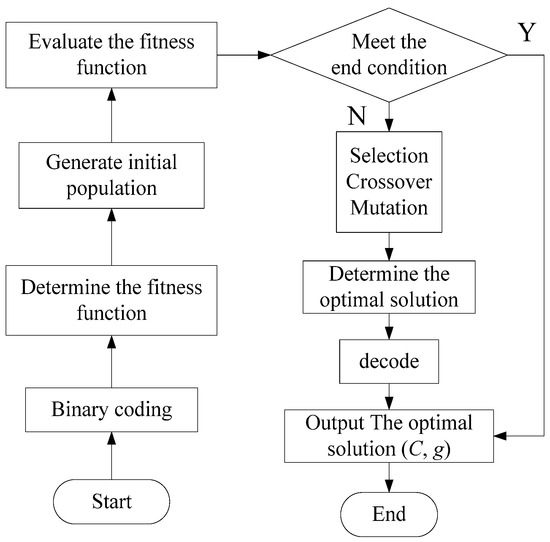 The penalty factor represents the error tolerance. The higher the value of , the more likely the error cannot be tolerated. An exorbitant value of may decrease the generalization ability of the classifier. Hence, the and values have a significant effect on the classification accuracy. The Genetic Algorithm (GA), proposed by Professor Holland and his students, is used to search for the minimum value of and the corresponding value of [19]. The flow chart for the GA is shown in Figure 2.