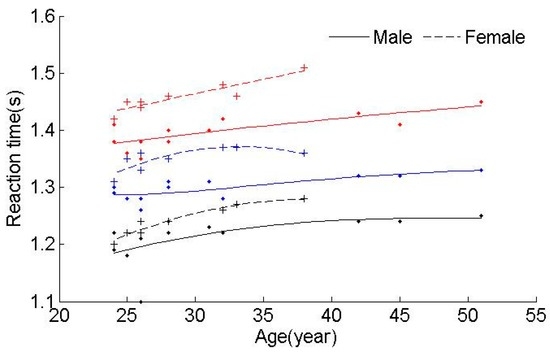 Driving fatigue is influenced by many types of factors. Driving over a long period of time eventually results in mental fatigue or drowsiness, although mental fatigue or drowsiness may also occur during shorter drives. Hence, it is hard to establish a formula that can be used to define the relationship between the reaction time and α/β. Fatigue classification can accurately solve this problem and eliminate the time factor. The relationship between the reaction time and α/β can then be obtained from the results of the classification. Due to different individual features, the results are also different. Figure 3 shows that the reaction time changes with age and gender for different mental levels. In Figure 3, the black data points represent Level 1, the blue data points represent Level 2, and the red data points represent Level 3. Table 6 gives the results that show that the reaction time changes with mental levels.