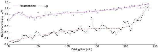 It can be concluded from Figure 4 that α/β increases with time, and the reaction time decreases first and then increases. This indicates that the reaction time does not always have a positive correlation with α/β, especially during the initial period. To analyze the relationship between α/β, the reaction time and driving fatigue, the driving process has been divided into three periods.