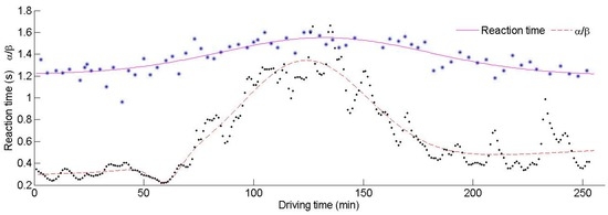 The third period (189–240 min): The driver became fatigued quickly as the monotonous driving task progressed further. As the driving time accumulated, the driver started to feel sleepier and lost interest in remaining awake. The slope of α/β increased quickly after 188 min, and the value of α/β rose with astonishing speed. The reaction time also increased more quickly than before. The driver was fatigued and the reliability of the driver was low during this period, leading to a decrease in control of the vehicle. It can be concluded that a fatigued state can reduce a driver’s ability to respond to stimuli. It is not appropriate to continue driving any further during this period.