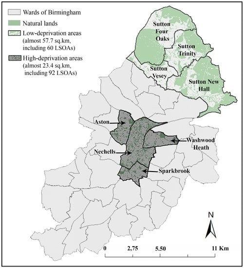 Low- and high-deprivation areas were identified on an electoral ward scale. For this purpose, the Index of Multiple Deprivation (IMD)—an aggregated score of deprivation across England [,] —was used. The IMD is published at Lower Layer Super Output Areas (LSOAs) level: the geographic areas that share similar populations of around 1500 persons [,]. LSOAs of Birmingham were classified by using the IMD to identify the 20% most deprived and 20% least deprived LSOAs in the city, which were then used to classify the city’s wards. A ward was identified as a relatively low- (or high-) deprivation area of city, if more than 50% of its area was covered by the least (or most) deprived LSOAs. In this way, four low-deprivation and four high-deprivation wards were identified in Birmingham (Figure 1). These wards were used for participant recruitment.