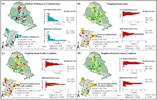 Disparities in participants’ outdoor walking levels between low- and high-deprivation areas are presented in Figure 2A. This figure shows that high and medium outdoor walking levels are less prevalent in high-deprivation areas than in low-deprivation areas. The results of t-test also show that average outdoor walking level in high-deprivation areas is significantly lower than in low-deprivation areas (Figure 2A).