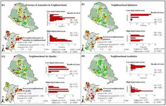 Figure 2 presents inequalities in perceived neighbourhood safety, pedestrian infrastructure and aesthetics in low- and high-deprivation areas. As this figure shows, distributions of perceived good neighbourhood safety (Figure 2B) and good neighbourhood aesthetics (Figure 2H) are higher in low-deprivation areas than in high-deprivation areas. Similar trends were found for perceived neighbourhood pedestrian infrastructure (i.e., traffic condition (Figure 2C), pavement condition (Figure 2D), presence of amenities (Figure 2E), quietness (Figure 2F) and air quality (Figure 2G)). The results of the t-tests indicate that these differences are significant (Figure 2). Therefore, participants from high-deprivation areas perceived less safety, worse pedestrian infrastructure and lower aesthetic appeal in their neighbourhoods than those from low-deprivation areas.