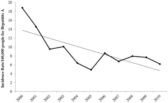 Figure 2. Incidence rate per 100,000 people for hepatitis A in Jordan (2000–2010). Source: Jordanian Ministry of Health data [33].