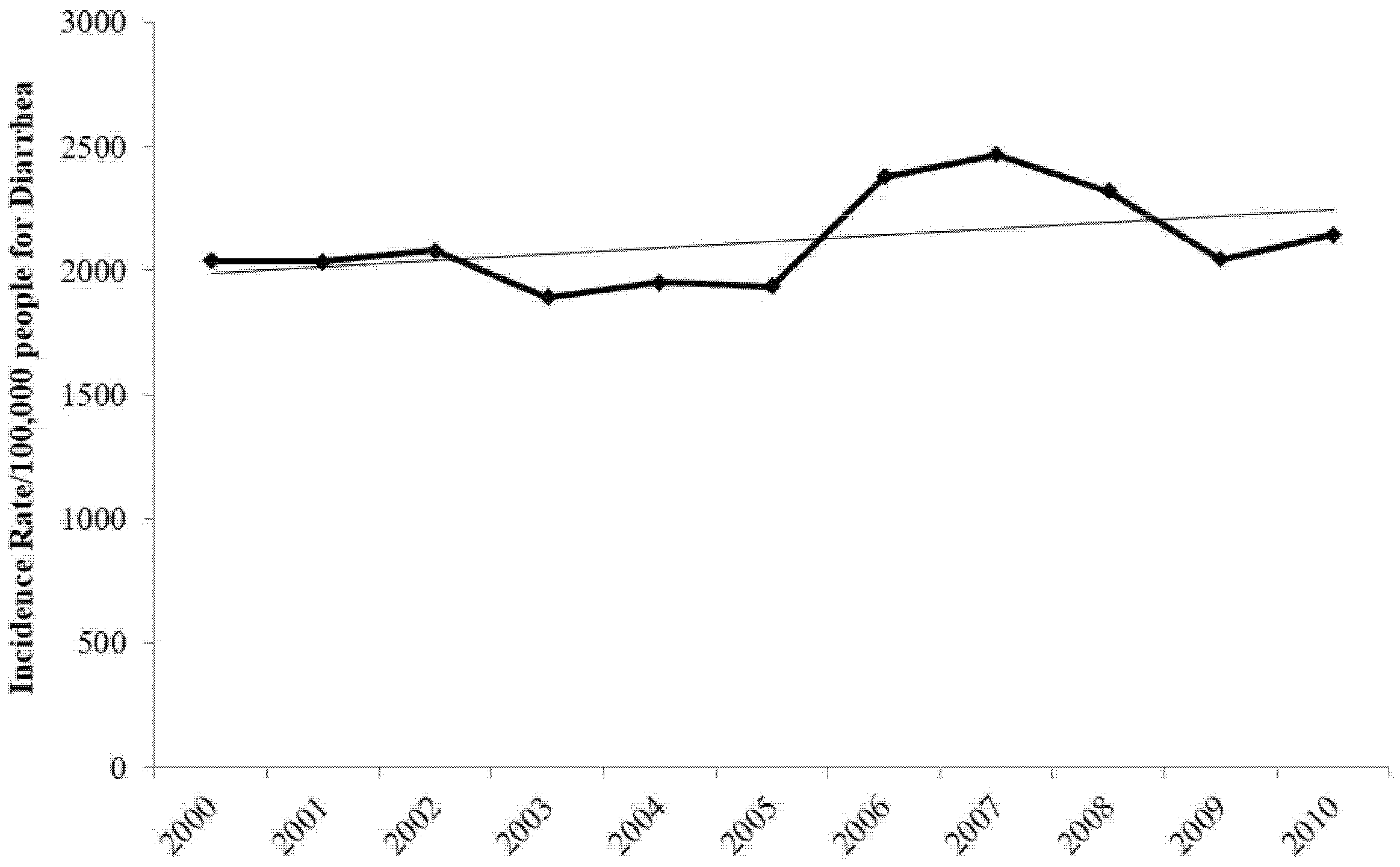 Figure 1. Incidence rate per 100,000 people for diarrhea in Jordan (2000–2010). Source: Jordanian Ministry of Health data [33].