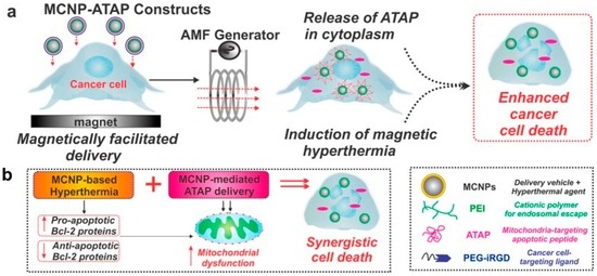 Schematic diagram depicting magnetically targeted delivery of MCNP-ATP to brain and breast cancer cells. (a) The release of ATAP from the MCNPs together with the induction of magnetic hyperthermia in the presence of an alternating magnetic field (AMF) results in synergistic cell death; (b) MCNP-based hyperthermia can inactivate anti-apoptotic bcl-2 proteins with a concomitant increase in the pro-apoptotic bcl-2 proteins, which results in cancer cell apoptosis, while MCNP-ATP can permeabilize the outer mitochondrial membrane and induce mitochondrial dysfunction. MCNP, magnetic core-shell nanoparticles; PEI, polyethylenimine; ATAP, amphipathic tail-anchoring peptide; PEG, polyethylene glycol; iRGD, internalizing RGD. Reprinted with permission from [65].