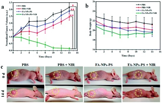 In vivo photodynamic therapy (PDT) characterization of MCF-7 tumor-bearing mice in different groups of phosphate-buffered saline (PBS), PBS + near infrared (NIR), folic acid-functionalized, photosensitizer-loaded Fe3O4@NaYF4: Yb/Er (FA-NPs-PS) and FA-NPs-PS + NIR, (Statistical analysis with Student’s t test: * p < 0.05, ** p < 0.01). (a) The relative tumor volume change in different groups; (b) the body weight change of mice in different groups; and (c) images of different groups of MCF-7 tumor-bearing mice at the beginning and at the end of 15-day treatments. Reprinted with permission from [78].