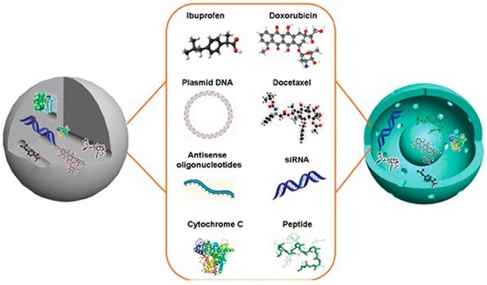 The tailorable mesoporous structure, high surface area and large pore volume make mesoporous silica nanoparticles excellent drug delivery vehicles [79]. The first mesoporous silica nanoparticles-based drug delivery system was reported in 2001 [80]. Until recently, silica nanoparticles has been used to encapsulate and deliver various drugs such as ibuprofen, doxorubicin, camptothecin, cisplatin, alendronate, peptide drugs, protein drugs and genes, as sketched in Figure 4 [79].