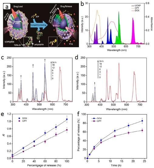 (a) schematic drawing of real-time monitoring of ATP-responsive drug release based on polypeptide wrapped zincdipicolylamine-Zn2+-upconversion nanoparticles@mesoporous nanoparticles (TDPA-Zn2+-UCP@MSN); (b) spectrum overlaps between the absorption of anticancer drugs doxorubicin (DOX) and camptothecin (CPT) and the emission of the core-shell UCP@MSN; (c,d) time-dependent emission spectrum of the polypeptide wrapped TDPA-Zn2+-UCP@MSN loaded with DOX and CPT in the presence of 5 mM ATP, respectively; (e) linear relationships between the percentage of drug release and the ratiometric signal (R) of the UCP. For DOX, R is the ratio of I472nm to I656nm and R for CPT is the ratio of I365nm to I656nm; and (f) time-dependent release for DOX and CPT monitored based on the ratiometric emission of UCP. Reproduced with permission from [83].