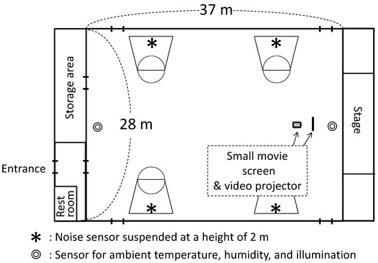 The school camp was a discretionary social event organized by the parent-teacher association of an elementary school. The school camp was scheduled on weekends in July (early summer), from Saturday afternoon to Sunday morning, and included recreational and educational activities. A total of 109 participants, including pupils of the elementary school and their parents, were assembled at the school at 15:15 on Saturday, stayed overnight at the gymnasium with a floor space of 1050 m2 (approximately 28 m × 37 m), and were disbanded at 8:45 on Sunday. Simple meals were provided for dinner and breakfast. Smoking and the drinking of alcoholic beverages were prohibited during the school camp. The scheduled time for sleep was from 21:30 to 6:00. When the lights of the gymnasium were turned off at 21:30, an animated movie was projected for 2 h for children who did not feel sleepy at that time. The small movie screen (2 m × 2 m) was located adjacent to the stage in the gymnasium (Figure 1). The participants slept on the floor of the gymnasium, with sleeping bags that had a polyurethane mattress. For the subjects of the present study, we distributed the same set of sleeping bags and polyurethane mattresses to control for the effect of different bedding.