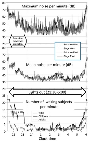 Interestingly, the number of waking subjects in each minute throughout the night showed similar patterns with the changes in the noise level. This result could suggest a potential mutual relationship between environmental noise and the number of waking subjects (i.e., nocturnal noise was made by waking subjects and that nocturnal noise aroused the subjects, and vice versa). As noted in Figure 2, at least one of the 22 subjects was awake during most of the lights-out period. As the total number of the participants residing in the gymnasium was 109, it appeared that there was no time point during the lights-out period at which all the participants soundly slept; this suggests that the waking subjects might make noise that would disturb the sleep of their neighbors. As environmental noise during sleep is known to be associated with various adverse health consequences [27], we believe that instituting measures against nocturnal noise may be a major consideration for evacuation shelter management.