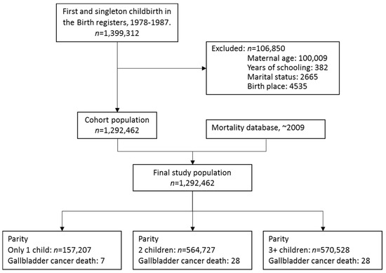 All women with a first and singleton childbirth in the Birth Register between 1 January 1978 and 31 December 1987 are included in our cohort. During this period, a total of 1,399,312 first and singleton births in Taiwan were recorded. The Birth Registry also provided information on any subsequent births. Among the 1,399,312 primiparous women, we excluded 106,850 subjects because data were missing on one or more variables such as maternal age (n = 100,099), years of schooling (n = 382), marital status (n = 2665), or birth place (n = 4535). After removing data with missing observations, we were left with 1,292,462 women with complete information for the analysis (Figure 1). We have previously described the details of our cohort in an earlier publication [30].