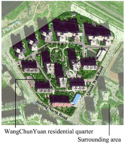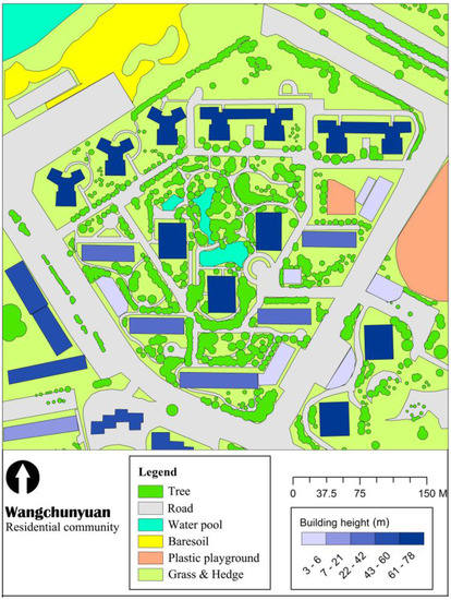 A typical high-rise residential quarter, known as Wangchunyuan (WCY) was selected for this study. WCY consists of eight buildings with 26 stories (78 m) and five buildings with 14 stories (42 m) (Figure 1). Inside the residential quarter, driveways were paved with asphalt, and sidewalks used concrete and cobblestone as pavement materials. The green area ratio is approximately 40%, which is above the average level of greenspace ratio for residential quarters in Beijing (Figure 2). There are approximately 2760 households in this residential quarter. According to a random house survey, the proportion of children (younger than 10 years old) and elderly (older than 60 years old) are 14% and 16%, respectively.