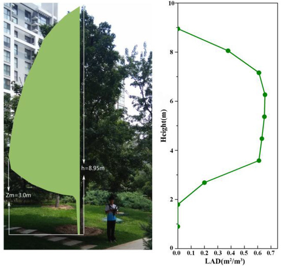 Leaf area index (LAI) can be assessed directly by using harvesting methods or non-harvesting litter traps during autumn’s leaf-fall period in deciduous forests. While the direct methods give the most accurate results, they are destructive and time-consuming. Some indirect methods and instruments, which are faster and amenable to automation, have been developed. After comparison of different instruments used for LAI assessment, LAI-2000 and hemispherical cameras were proved to be the most satisfactory methods [34]. The vegetation parameters required by ENVI-met for the WCY simulation were collected on-site. We measured the LAI using a LAI-2000 plant canopy analyzer (LI-COR Inc., Lincoln, NE, USA) for major tree species. Then the LADs of specific tree species were calculated according to the empirical LAD model provided by Lalic and Mihailovic [35]. Parameters required for this model include tree height (h), the maximum value of LAD (Lm), and the corresponding height with the maximum value of LAD (zm). Then, the calculated LADs were put in the ENVI-met plant database for 3-D reconstruction of the tree canopy. Figure 3 represented a mono maple (Acer mono Maxim) which is one of the most widespread deciduous trees planted in residential quarters in Beijing and its LADs at different height levels.