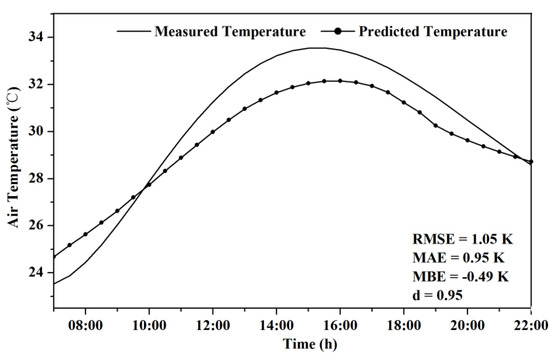 The root mean square error (RMSE), mean average error (MAE), mean bias error (MBE) and the index of agreement (d) were calculated to evaluate the accuracy of the simulation results. According to results (Figure 4), the RMSE is 1.05 °C and MAE, MBE are 0.95 °C and −0.49 °C respectively. The index of agreement was 0.95, which indicates even with the lower variance and the underestimation of peak daytime temperature, modeled Ta at 1.5 m above ground showed generally good agreement with field measurements.