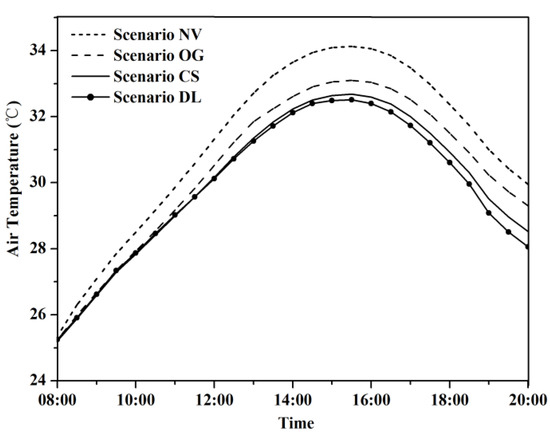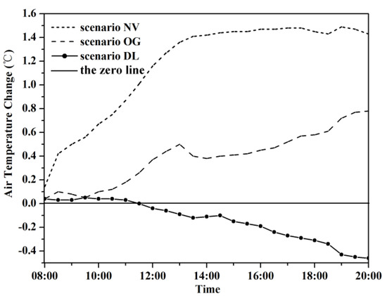 We chose hourly averaged air temperature at 1.5 m above ground over the whole modeled area to examine the thermal conditions under four greening modification scenarios. According to the ENVI-met simulation results, the air temperatures of the base case were between 23.9 °C and 32.6 °C during 8:00 to 20:00 with the peak temperature at 15:00. The base case was then compared with three other scenarios over the same period of time. Figure 5 shows the variations of air temperatures at 1.5 m above ground of four scenarios (NV, OG, CS, and DL), which follow similar pattern of constantly increasing from 8:00 to 15:00 and decreasing from 16:00 to 20:00. The scenario NV and scenario OG showed higher temperatures over the whole course of the timeframe, and the air temperature differences from the base case gradually increased from 8:00 onwards with the highest increasing of temperature (1.49 °C and 0.72 °C, respectively) recorded at 20:00 (Figure 6). In term of the vegetation, the results indicated that both grass and tree have the potential to reduce air temperature. Grass lowers air temperature mainly through evapotranspiration, while tree lowers air temperature by both evapotranspiration and sheltering solar irradiance from baking the area below the tree canopy. The scenario DL displayed marginal decrease in air temperature (0.17 °C on average) compared with the base case with the largest temperature decrease of 0.47 °C (Figure 6). When looking into particular spatial positions, the scenario DL demonstrated noticeably different cooling rates, which can achieve up to 2.4 °C right beneath the tree canopy, while the cooling power is negligible at positions outside the canopy and exposed directly to solar radiation.